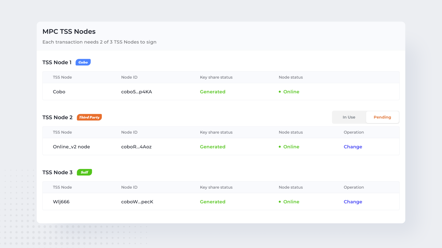With MPC-TSS, a flexible quorum approval scheme (“m out of n” key-shares) can be implemented. Cobo recommends a “2 out of 3” configuration, where three MPC key-shares will be generated independently by you, Cobo, and an entrusted third party disaster recovery service provider. To sign transactions, at least two key-shares (you and Cobo) are required to participate. The key-share held by the entrusted third party disaster recovery service provider is securely stored offline at all times and is solely intended for backup and recovery purposes, such as if your key-share is lost or compromised, or in the rare event that Cobo services were disrupted.