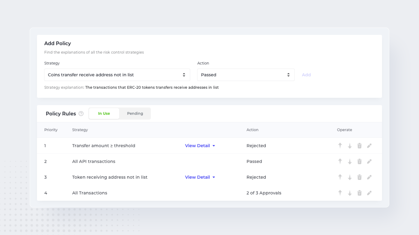 Cobo MPC Wallet utilizes Cobo’s superior risk management framework to effectively combat against every attack vector and cater to your compliance requirements. Through Cobo’s intuitive platform, you can effortlessly customize granular policy rules such as spending limits, whitelists, blacklists, and more, as well as implement real-time on-chain monitoring, screening rules and notification alerts.