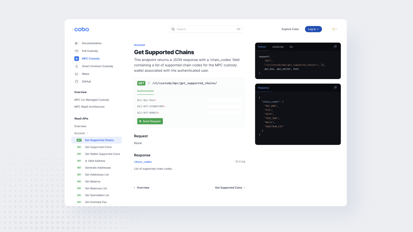 Cobo MPC Co-managed Custody offers simple wallet APIs and plug-and-play SDKs, supporting wallet-as-a-service (WaaS) integration. You can easily and quickly deploy an enterprise-grade wallet infrastructure into your applications and manage thousands of tokens across the majority of active public blockchains within a single wallet interface. Cobo WaaS allows you to generate and manage addresses on all supported chains, send and receive tokens, manage token sweep, interact with smart contracts, receive transaction notifications, view transaction history, and more. Cobo provides client libraries in five programming languages — Python, JavaScript, Golang, Java, and PHP.