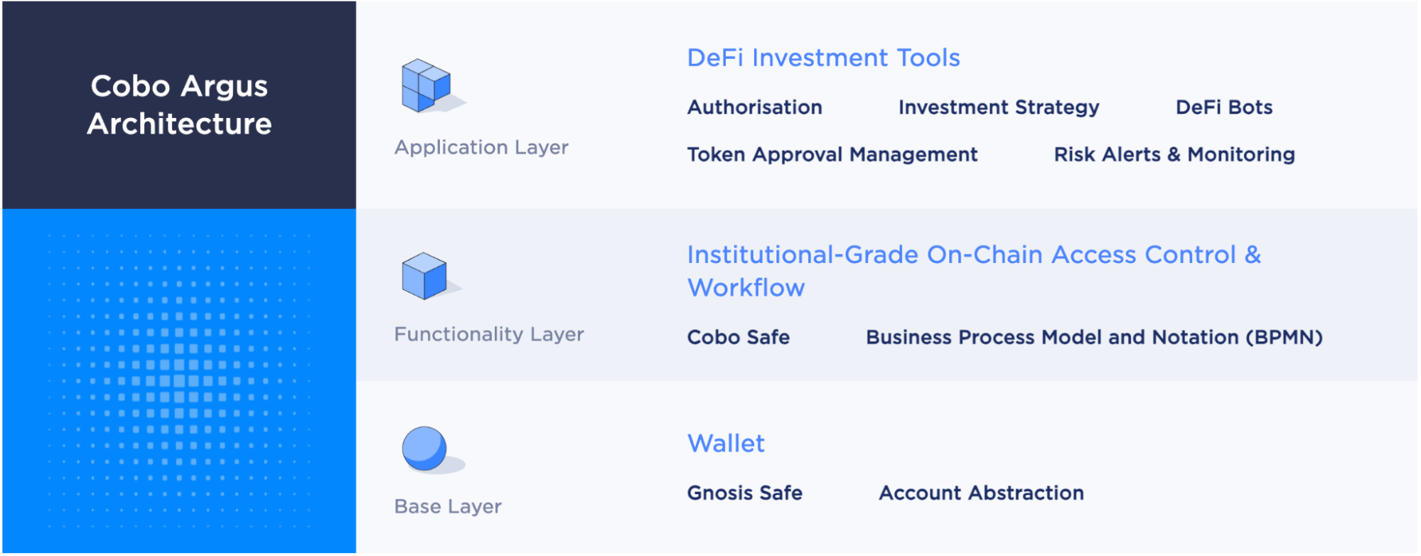 Cobo Argus consists of three layers: Base Layer, Functionality Layer, Application Layer.- Base Layer:Also called the Wallet layer, it’s about the wallet or custody technology. Argus is built on top of the Gnosis Safe, a smart contract based multisig wallet. In future, the Argus can be also extended on the Account Abstraction wallet.
